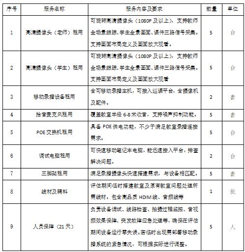为保障审核评估工作有序开展,确保评估专家线上听课看课环节顺利进行,特采购线上评估条件保障录播设备租用项目,诚邀潜在供货商参与,有关事项通知如下: