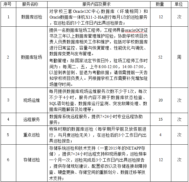 为保障数据库稳定运行,夯实我校各业务系统对外服务的基础数据支撑能力,通过数据库运维可为我校各业务系统数据完整性和可靠性提供技术保障,特采购2026年数据库、虚拟化和存储运维服务项目,诚邀潜在供货商参与,有关事项通知如下: