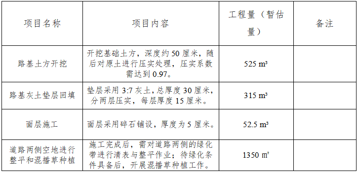四、采购内容:新建道路起于第二餐厅东南侧的正式道路,终点为新垃圾台,全长约210米,路面宽度4米,路基宽度5米(道路两侧各外放50厘米)。具体工程做法如下:1. 路基土方开挖:开挖基础土方,深度约50厘米,随后对原土进行压实处理,压实系数需达到0.97;2. 路基灰土垫层回填:垫层采用3:7灰土,总厚度30厘米,分两层压实,每层厚度15厘米;3. 面层施工:面层采用碎石铺设,厚度为5厘米;4. 土方开挖后产生的杂土运往我校图文信息中心西侧空地,拌合灰土取土从该区域取用;5. 施工完成后,对道路两侧空地进行整平和混播草种植。工程量清单如下: