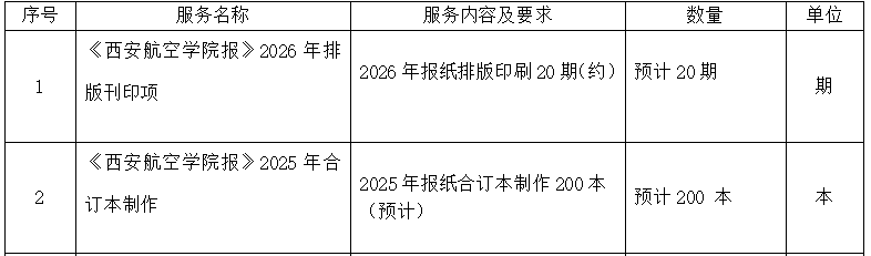 为做好《西安航空学院报》2026年排版刊印工作,特采购《西安航空学院报》2026年排版刊印服务,诚邀潜在供货商参与,有关事项通知如下: